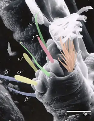 Larvae are about 140 μm (0.0055 in) long, have six legs, and are bright orange-red when newly emerged, later becoming opaque-orange.[3] The protonymphs and deutonymphs are somewhat transparent, with some of their inner organs appearing a diffuse green colour, with black or yellow patches. Like the adults, they are eight-legged.[2]