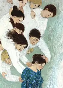 She Will Find What Was Lost depicts many angels blessing and looking at a woman, who seems to some viewers to be unaware of their presence. It was on the cover of the February 2017 Ensign,[19] and is on display in the LDS Conference Center as part of the LDS Church's collection.[20] Viewers interpret the painting in different ways; some see it as depicting divine revelation and others see it as showing family history.[21] Of the painting, Kershisnik wrote, "My intention for this piece was to speak to the most intensely private and intimate kind of supernatural interference, influence, and assistance... Many unseen forces are interested in you, love you, and work to influence matters for your profound benefit. Most of what we all do is resist it, misinterpret it, or mess it up, but my experience indicates that these unseen efforts persist impossibly. I thank God for that."[22]