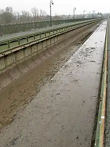 The aqueduct is built on fourteen piers. These piers support a single steel beam in turn supporting a steel channel which contains more than 13,000 tonnes of water, 2.2 meters deep and 6 metres wide allowing boats with a 1.8m draught to cross. The width of the aqueduct, towpaths included, is 11.5 meters and its length is 662.7 meters.[4] There is a line of standard lamps on each side of aqueduct. Each end is marked by two ornamental columns in imitation of the Pont Alexandre III in Paris. Eight sluices make it possible to empty the aqueduct in the event of severe freezing.