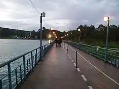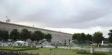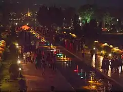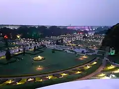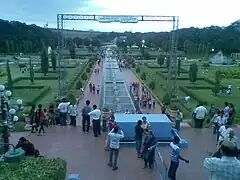 The Brindavan Gardens is a garden located 12 k.ms from the city of Mysore[1] in the Mandya District of the Indian State of Karnataka. It lies adjoining the Krishnarajasagara Dam which is built across the river Kaveri.[2] The work on laying out this garden was started in the year 1927 and completed in 1932.[3][4] Visited by close to 2 million tourists per year, the garden is one of the major attractions of Srirangapatna.[5] Sir Mirza Ismail, the Deewan of Mysore, a man with a penchant for gardens, founded the Brindavan Gardens (Krishnaraja Sagar Dam in particular) and built the Cauvery River high-level canal to irrigate 120,000 acres (490 km2) in modern Mandya district. The gardens were designed by German botanist and landscape designer Gustav Hermann Krumbiegel.