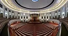 The centre of City Hall features an auditorium, based on the Pantheon, Rome, and several smaller reception rooms. The auditorium is a large circular hall that can seat up to 1,600 people and is covered by the largest copper dome in the southern hemisphere. Beneath this dome there are 8,500 LED lights that display a light show.[2] When originally built it was intended that the building would house most of the council's administrative offices, Aldermen's (councillors') offices, the Council Chamber, a public library and several reception rooms, in addition to the auditorium. As the role of local government increased in the 1950s and 1960s, the reception rooms, hallways and side entrance vestibules (in Adelaide and Ann Streets) were converted to office space. Additional offices were constructed on the roof and in the basement.