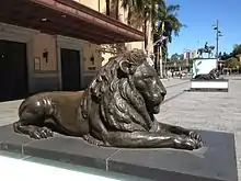 The bronze lion sculptures and statue of King George V, in front of the King George Square façade of Brisbane City Hall, were initially part of the King George V memorial, which was unveiled in 1938 as a tribute to the King from the citizens of Brisbane. The statue initially faced towards city hall, however this was changed in 1975 following a visit by Queen Elizabeth II, who remarked, 'why is grandpapa retreating?' upon seeing the statue.[31] In 2007, the lions, modelled on the bronze lions of Trafalgar Square, and the statue were removed for renovations to the Square. They were re-incorporated into the newly redeveloped King George Square in 2009.