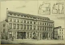 The foundation stone for the new building was laid on the 18 February 1867.[4] It was designed by James Williams in the Italianate style, built in ashlar stone and was officially opened on 25 March 1868. The design involved a symmetrical main frontage of fifteen bays facing onto Small Street. The central bay, which was slightly recessed, featured a round headed opening formed by columns supporting imposts, an arch and a keystone. The wings featured central recesses of three bays each containing polished Doric order columns. The other bays on the ground floor were fenestrated by sash windows separated by Doric order pilasters, while the first floor was fenestrated by sash windows with cornices supported by brackets and the second floor was fenestrated by smaller square shaped sash windows. At roof level, there was a cornice and a balustraded parapet. The building was extended to create a new wing, designed by Edward Rivers, for the accommodation of postal staff in 1889. The works provided difficult because they required the demolition of the old cellars of "Creswicks".[5] The building was extended again, to a design by John Rutherford, in 1909.[3]