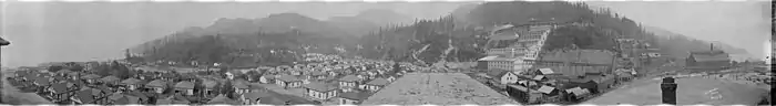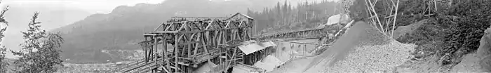 Britannia Mines began mining copper ore from Mount Sheer and the surrounding area on the eastern shore of Howe Sound in 1903.[2] Because the ore contained relatively little copper, an ore concentrate was produced before shipment to an ore processing plant.[1] This necessitated the construction of a concentrator, and both an inclined and aerial tramway system to transport crushed ore from the mine to the concentrator.[3] In 1904, a gravity concentrator was installed at the site,[2] capable of processing 200 tons of ore daily.[3] The output was a concentrate of about 10% copper, which was sent to Crofton for smelting.[3] The first shipment was made in December 1905.[3] A holding company called the Howe Sound Company held Britannia Beach Mining and Smelting Company. The Howe Sound Company also owned some mines on Mt. Sicker and a smelter at Crofton near Ladysmith.