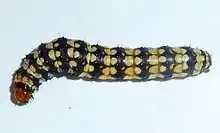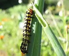 The larvae are aposematically coloured in pale yellows on blacks and browns. They are unpalatable to most vertebrate predators, and also poisonous, feeding as they do, on largely unpalatable and poisonous plants. They are slightly bristly, but the bristles seem to be sensory rather than irritant. Typically they grow to about 40 mm long before pupation.[4]