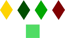 The practice of wearing battalion specific insignia (often called battle patches) in the B.E.F. began in mid 1915 with the arrival of units of Kitchener's Armies and was widespread after the Somme Battles of 1916.[73] The patches shown were worn by the division during 1917.[74] There was no overall division scheme for the battle patches, they were adopted gradually from mid 1916.[75]