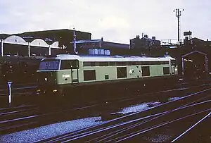 From 1965 onwards the locomotive, still owned by Brush, was under contract with British Railways so that operation and repair would be handled by them, with only major repairs being handed back to the builder. Allocated to Bristol Bath Road alongside the Class 52 Western fleet, the locomotive worked Paddington-Bristol diagrams with them.[9] In 1970, British Rail bought the locomotive from Brush at its scrap value. BREL Swindon rebuilt it; air braking replaced vacuum braking, and it was repainted in corporate Rail Blue with full yellow ends with the new number 1200.[10] Falcon was first allocated to Bristol Bath Road again working alongside Class 52s, and by March 1974 to Ebbw Junction,[11][12] for use on iron ore trains. During its time at Ebbw Junction, the steam heating boiler was isolated.