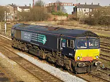 The first locomotive shipped to the UK arrived at Immingham in June 1998,[7] taken to Derby for testing.[2] The second was taken to AAR's Pueblo Test Centre for endurance testing, before shipping to the UK.[2] The locomotives then shipped at a rate of 11 per month into the UK via Newport Docks, until the order was completed in December 2001.[2] After unloading, EWS engineers then simply took off the tarpaulin, unblocked the suspension, and finally as each was shipped with water and fuel, connected the batteries, before starting the engine and handing the locomotive into service.[2] The ability to simply start up '66s' on the dockside and drive them under their own power to depots to enter service was nothing short of a revelation compared with many other BR locomotives, particularly the BR Class 60s.[8]