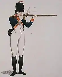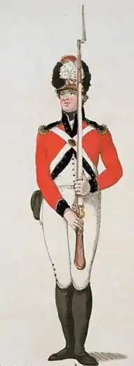 The Volunteer Corps typically drew its members from the propertied classes. Officers were usually members of the gentry (though some junior officers were members of the professional or middle classes) and the enlisted ranks tended to be from the lower middle classes (for example shopkeepers and publicans).[9] The failed Expédition d'Irlande of 1796 and invasion at Fishguard caused the expansion of the corps, including the formation of workplace units such as the 863-strong Cyfarthfa Ironworks unit in South Wales, in which the enlisted ranks were filled by the workmen and the officers were drawn from the clerks and foremen. Such units, made up of working-class men, became more common in the late 1790s and early 1800s due to the increased fear of invasion.[10] Indeed, there was at least one case of de facto conscription, in which a factory-owner decreed that all his workers must join the corps or else be sacked.[11]