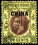 Postage stamps of Hong Kong were used from 1862 on, but after 1 January 1917 the Hong Kong stamps were overprinted "CHINA". The initial overprinting including 16 values ranging from 1 cent to 10 dollars; from 1922 on, an additional 10 values with the Multiple Script CA watermark were also overprinted.