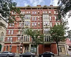 The Brittany Apartment Building is a historic apartment building in downtown Cincinnati, Ohio, United States. A Queen Anne structure constructed in 1885,[1] it is a six-story rectangular structure with a flat roof,[2] built with brick walls and elements of wood and sandstone.[3] It was built by the firm of Thomas Emery's Sons,[4]: 7 Cincinnati's leading real estate developers during the 1880s. It is one of four large apartment complexes erected by the Emerys during the 1880s; only the Brittany and the Lombardy Apartment Buildings have endured to the present day.[2] Both the Lombardy and the Brittany were built in 1885 according to designs by Samuel Hannaford;[2]: 7 at that time, his independent architectural practice was gaining great prominence in the Cincinnati metropolitan area.[4]: 11