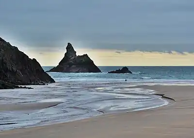 Broad Haven South is known for Church Rock, which protrudes from the water around 150 yards from the shore. Popular with surfers and bodyboarding, its south-facing beach with dramatic cliff views backed by sand dunes, and the expansive National Trust woodland and the lily ponds, it is one of Pembrokeshire's finest beaches.