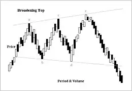 Broadening top (a.k.a. a megaphone pattern) is technical analysis chart pattern describing trends of stocks, commodities, currencies, and other assets. Broadening Top formation appears much more frequently at tops than at bottoms. Its formation usually has bearish implications.[1]