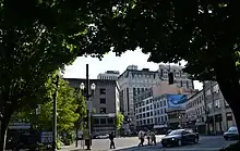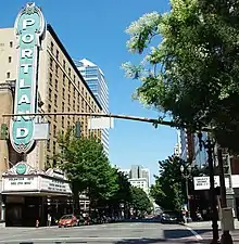 The section west of the Willamette was the most vibrant street in downtown Portland even before it was renamed, in 1913, from 7th Avenue to Broadway, and this continued for decades.[1] During the day, it was a bustling shopping street, and remains a busy shopping street today. The street hosted several movie theaters and vaudeville playhouses, and at night their many neon signs and lighted marquees gave the area a look that was similar to Manhattan's more-famous Broadway. Almost all of the movie theaters have since closed, most in the 1960s and 1970s, but the street remains the center of downtown's nightlife.[1] Theaters still located on Broadway in downtown include the Arlene Schnitzer Concert Hall (in a former Paramount Theatre) and the Antoinette Hatfield Hall.