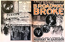 Broadway Broke is a 1923 American silent drama film directed by J. Searle Dawley and starring Mary Carr, Percy Marmont, and Gladys Leslie.[1][2] A struggling former Broadway actress tries to restart her career by turning to playwriting.