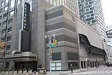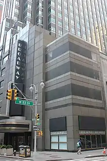 The modern facade of the theater (which has its own address at 1681 Broadway) is part of the 1675 Broadway office building,[5] completed in 1990.[10] The facade of 1675 Broadway, designed by Fox & Fowle, consists of polished granite in deep-green and greenish-gray hues.[5][11] The seven-story facade on Broadway, which contains the entrance, was refaced in a similar material, with contemporary and Art Deco-style decorations.[11][12] There is an Art Deco marquee in front of the theater as well. The massing consists of several horizontal and vertical setbacks, inspired by the massing of 30 Rockefeller Plaza. The lower stories have recessed windows; the upper-story windows are surrounded by flame-finished granite panels, which give the impression of depth.[12] When 1675 Broadway was constructed, the theater's air rights were used to increase the height of the office building.[12][13]