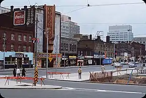 Taylor wrote that when New City Hall was to be built on the north side of the street, politicians felt that the Broadway and the Casino Theatre, another Burlesque theatre just five doors west, pawn shops and the block's other businesses were inconsistent with civic dignity, and the whole block was expropriated and demolished in 1965.[1] Following a two year construction, from fall 1972, the block became the site of the large Four Seasons Sheraton Hotel (since rebranded as Sheraton Centre Toronto Hotel). At the far corner was an office block with a Toronto Dominion Bank branch, which was also demolished and replaced with a low rise glass pavilion housing a TD Bank.