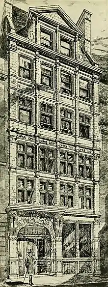 The hall was originally a monastery that dated from the 10th century.[3] The site for the hall was bought with the proceeds of a bequest from a John Throwstone in 1519.[4] The hall was rebuilt after being damaged in the Great Fire of London in 1666.[5] It was described in 1815 by John Wilkes in his Encyclopaedia Londinensis as a "small but very handsome building".[6] After being little used by the Company of Broderers, it became a warehouse in the 19th century.[5] In 1889 during excavations for a basement, human bones were found as well as pieces of poetry and glass from Londinium, the Roman settlement.[3]