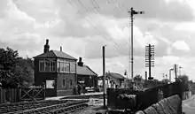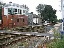 The Grade II-listed signal box at the station is a Smith and Yardley type 1 brick box opened in December 1875, almost certainly timed to service the new connections to short sidings that were opened that winter, these works being checked and then approved with minor modifications by the Board of Trade inspector Colonel Hutchinson in documentation dated February 1876.[11] One interesting requirement was that the wicket gates had to be locked by levers in the signal cabin and this basic protection can now be dated with certainty to that time.[11] The box, one of three types, was supplied by Manchester-based Emily Sophia Yardley, a widow who had taken over her late husband's ironmongery business, together with her step-brother William Smith, who was recorded in the April 1861 Census records as being an 'engineer' aged 21.[12] The extension to the goods yard at the station by the early 1900s, together with new loop lines and increased signalling, brought about an enlargement of the lever frame in the signal box. Inserting this new frame probably required the partial removal of some of the front brickwork of the 1875 cabin. This can be seen today in the distinct contrast between much older brick lower down and a quite different brick face on the upper area. The signal box has an operating floor which is 8 ft 7in above the platform level, according to early LYR Engineer's Office drawings. Bromley Cross signal box formerly acted as a 'fringe' to the power boxes at Preston (which controls the line to Blackburn) and Manchester Piccadilly (which supervises the passing loop and line south towards Bolton) – their train description systems were incompatible with each other and so the box here was retained to act as a link between them.[13] Its sole use now is to supervise the adjacent pedestrian foot crossing and the protecting signals (with four working levers), since the interface between the two signalling centres has been upgraded so that they can communicate directly.[14] In circa 2004 the signal box was modernised with timber work replaced in PVC (the windows were replaced in a different pattern), and new steel steps and an oversized metal safety cage finally added.[1] In November 2016 the foot crossing was entirely renewed, and the short timber-topped former link platform running under the front of the signal box removed, so exposing the lowest brick layers of the box for the first time in many decades.