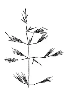 It is a perennial grass which may reach 1.6 meters in height. The inflorescence is an open array of spikelets, the lower ones drooping or nodding. The spikelets are flattened and have short awns at the tips of the fruits.