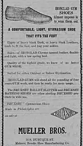 Brooks Sports, Inc. was founded in 1914 by John Brooks Goldenberg, following his purchase of the Quaker Shoe Company, a manufacturer of bathing shoes and ballet slippers.[9] Based in Philadelphia, it operated as a partnership between John Goldenberg and his brothers, Michael and Frank. By 1920, Quaker Shoes had been renamed Brooks Shoe Manufacturing Co., Inc., and its shoes were sold under the brand name Bruxshu. In addition to bathing shoes and ballet slippers, it sold a gymnasium shoe, Ironclad Gyms.[10] The company's innovations included the 1938 introduction of orthopedic shoes for children, Pedicraft,[lower-alpha 1] and rubber brakes for roller skates (then known as "quick stops"), patented in 1944.[12]