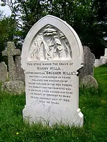A marble headstone, paid for by locals, was erected over his grave in the churchyard of St Nicholas, Brockenhurst.[4] It includes a carved tableau of him at work, in his distinctive wide-brimmed hat.[5] The Railway Inn where Brusher Mills was a regular was renamed The Snakecatcher.[2]