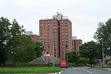 The Broomhall complex consisted of a sprawling network of 27 mid-rise tower blocks alongside the A61 Hanover Way, nowadays part of the Sheffield Inner Ring Road, on the edge of Sheffield City Centre in Broomhall.[19] It was located across the dual carriageway from Hanover House. In terms of design, the development at Broomhall can be thought of as a condensed version of the Park Hill estate, as they were both built to the same streets in the sky philosophy with deck access to properties. The Broomhall complex was constructed in 1967 by a consortium headed by the Shepherd Building Group and the Yorkshire Development Group.[19] There were a total of 619 dwellings at the Broomhall complex, with twenty 7-storey blocks of flats containing 23 dwellings each and seven 6-storey blocks containing 21 dwellings each.[19]