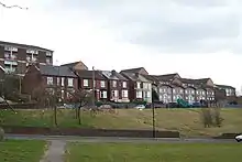 The Upperthorpe complex, also known as the Martin Street complex, is one of two sets of tower blocks constructed as part of the Netherthorpe Redevelopment Area, the other being the Netherthorpe complex at Brook Hill around 0.3 mi (0.48 km) to the south.[17][18] Construction of the complex at Upperthorpe commenced in 1958 through building contractor Tersons Ltd., who later became part of the British Insulated Callender's Cables company, on behalf of Sheffield City Council. As a result, they are largely identical in design to the Herdings Twin Towers, which were also built by Tersons. The last blocks at Upperthorpe were completed in 1961. There are seven identical tower blocks at Upperthorpe, sited in a line on the south side of Martin Street and demarcating the northern edge of the Ponderosa park.[17][18]
