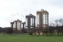 The Norfolk Park complex was one of the largest residential high-rise complexes ever constructed in the United Kingdom, consisting of fifteen blocks of seventeen-storey flats containing a total of 1,887 individual apartments located next to Norfolk Heritage Park.[26][27][28][29] Constructed in four distinct phases between 1963 and 1967, the 46 m (151 ft) tall tower blocks at Norfolk Park were all constructed to a largely identical design by M J Gleeson and Sheffield City Council municipal labour groups. The Norfolk Park towers were situated for the most part lining either side of Park Grange Road, rising from the bottom of the hill close to Sheffield City Centre at the northern end to the top of the hill next to the Manor estate at the southern end.[26][27][28][29]