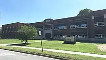 The present high school was constructed in 1922 and is designed in the Collegiate Gothic style popular during that time period. It is a two-story flat-roof structure with a dark red brick facade embedded with decorative limestone accents. Additions to the original building include the science wing on the east side, the competition gym on the northwest side and the auxiliary gym on the southwest side. The school is a contributing property in the Buchanan North and West Neighborhoods Historic District. The Buchanan Union High School existed at the same site from 1872 to 1922. A portion of the original building's first story remains standing immediately north of the Ray Miller Industrial Arts Center. The tower bell from the 1872 high school is on display just outside the main entrance to the science wing.[12][13]