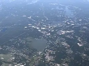 Budd Lake, which the community is named after, is the source of the South Branch Raritan River. A glacial lake at an elevation of 933 feet (284 m), Budd Lake has a surface area of 374 acres (1.51 km2).[17] It is 7–12 feet deep, and can have large algal blooms. The bog, created by thousands of years of decaying plant material, supports wetland plants such as black spruce and tamarack, which grow on the floating mass.[17] The lake is recharged through groundwater seepage through a series of wetlands, and serves as the headwaters of the Raritan River's South Branch.[18] It is closely bordered by U.S. Route 46 to the south, and Sand Shore Road to the east.[19]
