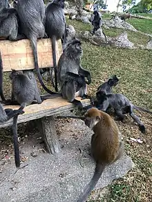 Bukit Malawati is home to the local silvered leaf monkeys and long-tailed macaques.[1][3][5][6] The silvered leaf monkeys at Bukit Malawati are accustomed to human presence, and are sometimes bold enough to approach visitors.[6] Tourists are discouraged from feeding the monkeys.