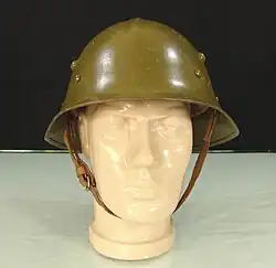 The general design was distantly reminiscent of the Stahlhelm, but with some considerable alterations. The general structure and depth were similar, but the brim was shortened, opened wider and more gradually turned. The ventilation apertures were retained, but set in smaller rounded fittings. The angles of the side and upper surfaces were conically increased with the aim of causing hits of over 90° angle to ricochet. From mid-front to mid-rear a well-pronounced projecting rib was shaped. As a result, the helmet received a very distinctive outline with only a distant likeness to the Stahlhelm.[2] It was made of steel with only a small quantity of the first model made of lighter laminated iron, exclusively as officers' dress gear. The edges of the shell were rolled over in the earliest type known as A, while on the later type known as B these were straight cut. In 1939 a new redesigned version with shallowed shell and shortened brim, known as type C, was brought into service.[1] An estimated 70% of all production was of this third model. Factory-issued helmets were initially dark greyish-green in colour with a small shield in Bulgarian flag colours on the right. Later new brighter pea-green shade was introduced.[3] The leather suspension, or liner, were produced in several different variants. The M36 helmet design became lighter, more compact, and more comfortable than the First World War-era designs and provided excellent protection.