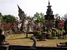 Sulilat's sculpture gardens rely upon the rich religious art tradition of the region. What sets them apart is the uncommonly large physical dimensions (made possible through the use of modern construction materials), highly individualized (and even quirky) artistic fantasy, and sporadic contemporary references (motorized vehicles, firearms, Western garments).