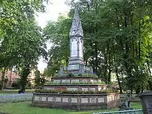 The Burdett-Coutts Memorial Sundial is a structure built in the churchyard of Old St Pancras, London, in 1877–79, at the behest of Baroness Burdett-Coutts. The former churchyard included the burial ground for St Giles-in-the-Fields, where many Catholics and French émigrés were buried. The graveyard closed to burials in 1850, but some graves were disturbed by a cutting of the Midland Railway in 1865 as part of the works to construct its terminus at St Pancras railway station. The churchyard was acquired by the parish authorities in 1875 and reopened as a public park in June 1877. The high Victorian Gothic memorial was built from 1877 and unveiled in 1879. The obelisk acts as a memorial to people buried near the church whose graves were disturbed; the names of over 70 of them are listed on the memorial, including the Chevalier d'Éon, Sir John Soane, John Flaxman, Sir John Gurney, and James Leoni.
