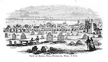 The first Pilgrim burial ground was on nearby Cole's Hill in 1620-21.[3] Originally, the Pilgrims constructed a fort on top of Burial Hill in 1621-22 (a reconstruction exists in nearby Plimoth Plantation).[4] The Burial Hill fort also served as a meeting house for the colony and for the First Parish Church until 1677.[4] According to tradition, the first grave on Burial Hill was Pilgrim John Howland's.[5] However, he did not die until 1672; other people claimed to be buried there died considerably earlier.[6]