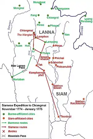 King Taksin of Thonburi decided to renew an expedition to Chiang Mai in 1774 due to the fact that the Burmese of Northern Lanna had harassed several Siamese border towns including Phichai and Sawankhalok. Thonburi court also heard of Hsinbyushin's grand plan to invade Siam from both northern and western directions. Taksin then conducted the pre-emptive strike on the Burmese at Chiang Mai as follows;[8]