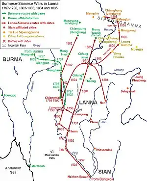 ![]() Burmese–Siamese Wars in Lanna; in 1797-98, 1802-3 and 1804 Siamese invasions of Chiang Tung (1802) and Chiang Hung (1805) Green depicts the Burmese. Red depicts the Siamese. | |||||||||