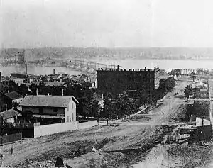 The first phase of hotel construction in Davenport lasted from 1836, when the city was founded, until just before the Civil War. Most of these hotels were small and were located near the Mississippi River to take advantage of the passengers disembarking from the riverboats.[4] The second phase marked the arrival of the railroad when the first bridge to cross the Mississippi was opened between Rock Island, Illinois and Davenport in 1856.[5] Two years later J.J. Burtis, who had operated the LeClaire House in Davenport, opened his own hotel. It had an entrance on the mainline of the Chicago, Rock Island and Pacific Railroad. The hotel rose to prominence in 1861 when Iowa Governor Samuel Kirkwood made the hotel his Civil War headquarters as the telegraph lines did not extend any further west.[6]