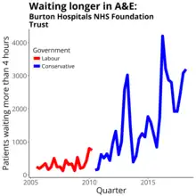 Four-hour target in the emergency department quarterly figures from NHS England Data from https://www.england.nhs.uk/statistics/statistical-work-areas/ae-waiting-times-and-activity/