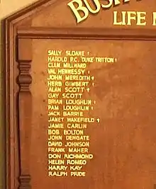 Life members included the Australian traditional singers Sally Sloane and Duke Tritton; the latter assisted Meredith with his song collecting and also served as club vice president for several terms. Other persons awarded life membership included founder members and original Bushwhackers John Meredith, Jack Barrie, Alan Scott, Brian Loughlin and Harry Kay, resident topical/humorous songwriter John Dengate, and more (refer board illustrated at right).