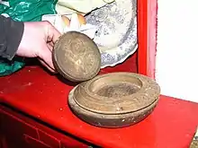 A butter stamp is a device for stamping a design onto a block of warm butter. Butter stamps were sometimes commercial but usually purely decorative and applied in homes. They were typically made of wood and feature simple designs of cows, flowers or geometric patterns and, if commercial, the name of the retailer. Often, they formed part of a box-like mould for forming the whole block. Other designs achieved the same effect by carving the design at the bottom of a butter mould. Part of the intent for commercial moulds and stamps was to demonstrate consistency in the quantity of butter sold. Both moulds and stamps are now normally inexpensive antiques.[1]