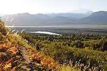 Byers Lake is a small lake in Denali State Park, within the Matanuska-Susitna Borough, Alaska, United States, 28 miles (45 km) north of Talkeetna. The lake is named for a fisherman who was brought there many times by bush pilot Don Sheldon in the 1950s.[1] It is accessible from the George Parks Highway and has a developed campground, several public-use cabins and a small boat dock. The Alaska Veterans Memorial is on a hilltop adjacent to the lake.[2] Gasoline-powered motors and floatplane landings are not permitted on the lake. The lake used to contain a sizable population of lake trout but due to overfishing in the time since the highway was built in 1972 the population has dwindled, and landings of lake trout are now rare, although there are still burbot in the lake as well. Migrating salmon also come into the lake but salmon fishing is not permitted. Campers are advised to keep a clean camp as the campground is frequently visited by bears. The lake is also home in summer months to trumpeter swans and common loons.[3]