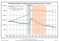 Development of population since 1875 within the current boundaries (Blue line: Population; Dotted line: Comparison to population development of Brandenburg state; Grey background: Time of Nazi rule; Red background: Time of communist rule)