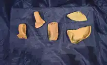 In 1768, 260 late Roman North African amphorae were found stacked in a chamber of the Kortin[upper-alpha 8] warehouses, twenty four of which had graffiti of a religious nature on them.[37] Given the distance from the main town, historians assume that these warehouse facilities were used for redistribution towards other harbours in the Central Mediterranean.[37] Large quantities of Byzantine era pottery were also found at the Kortin promontory in Marsa, with traces of a fire leading excavators to assume that the buildings and the quay were abandoned in late eight or early ninth century, with the date established due to the presence of globular amphorae on site.[38] The presence of earlier ceramics at the same level may indicate an earlier abandoning.[38]