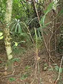 In flat lowland areas and especially along streams, areas of freshwater swamp forest notable tree species often include: Ficus benjamina, Livistona saribus, Crateva, Syzygium and Horsfieldia spp.[10] Naturally occurring patches of Bambusa blumeana (tre gai or tre la ngà) are also abundant in riparian areas and flooding forest. Other plants include Schumannianthus dichotomus ("cool mat") which occurs in muddy areas along streams.