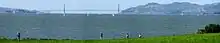 The park's east position in San Francisco Bay provides panoramic views of San Francisco, the Golden Gate Bridge, the Marin Headlands, and the East Bay hills. The park's terrain is characterized by very open grassy hills that have become popular for kite flying.[2] Paved paths run the perimeter and throughout the park where picnic tables and barbecue grills are available to the public.