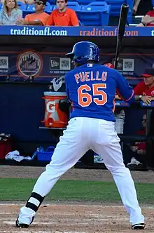 On July 2, 2007, Puello signed with the New York Mets organization as an international free agent. In 2008 with the GCL Mets, Puello batted .305/.350/.364. He spent the 2009 season with the rookie ball Kingsport Mets, slashing .296/.373/.423 with 5 home runs and 23 RBI. In 2010 with Savannah, he batted .292/.375/.359 and stole 45 bases. Puello was ranked the #77 prospect in the pre-2011 Baseball America rankings.[1] He spent the 2011 season with the High-A St. Lucie Mets, posting a batting line of .259/.313/.397 with career-highs in home runs (10) and RBI (50). Puello was added to the Mets' 40 man roster on November 18, 2011.[2] In 2012, Puello remained in St. Lucie, slashing .260/.328/.423 with 4 home runs and 21 RBI. After the 2012 regular season, he played for the Surprise Saguaros of the Arizona Fall League.[3] He spent the 2013 season in Double-A with the Binghamton Mets, hitting .326/.403/.547 with stolen 24 bases in 331 at bats.