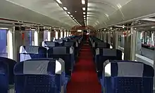 Since 2009, the InterRegio 1821/1822 from Arad to Constanța via Deva, Tîrgu Jiu, Craiova and Bucharest also travels to Constanța with an extra sleeperette car and sleeper car. The InterRegio rolling stock is formed of both single-decker cars painted in the painting scheme of CFR Calatori (blue and gray). Single-decker cars are all corridor-type, with the old cars having 8 seats per compartment in second class and 6 in first class whereas the new cars have 6 seats per compartment regardless of class (this type of coaches are used now for Regio Trains and rarely on InterRegio Trains). Double-decker cars have 4 seats per row in an open plan.