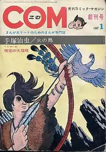 The first issue was the January 1967 issue, published in December 1966.[1][2] Osamu Tezuka and his publishing company Mushi Production created COM in reaction to the alternative manga magazine Garo's popularity, which at that time was around its highest circulation. Tezuka himself was a crossroads with his work, shifting to darker themes influenced by gekiga, targeting the readers who had grown up with his work and were interested in more mature narratives. He wanted to create a forum for manga artists to publish manga with experimental forms that would not be accepted in the commercial manga industry. The title of the magazine should stand for "Comics, Community and Communication".[3] In a statement published in the first issue of the magazine, Tezuka explained: "It is said that now is the golden age of manga. So shouldn't works of outstanding quality be published? Or isn't the real situation one in which many manga artists are being worked to death, while they are forced into submission, servitude and cooperation with the cruel requirements of commercialism?"[4][5] The magazine is considered to be one of the only non-commercial alternative to weekly manga mazines besides Garo, before offset printing became widely available in the early 1970s.[4]